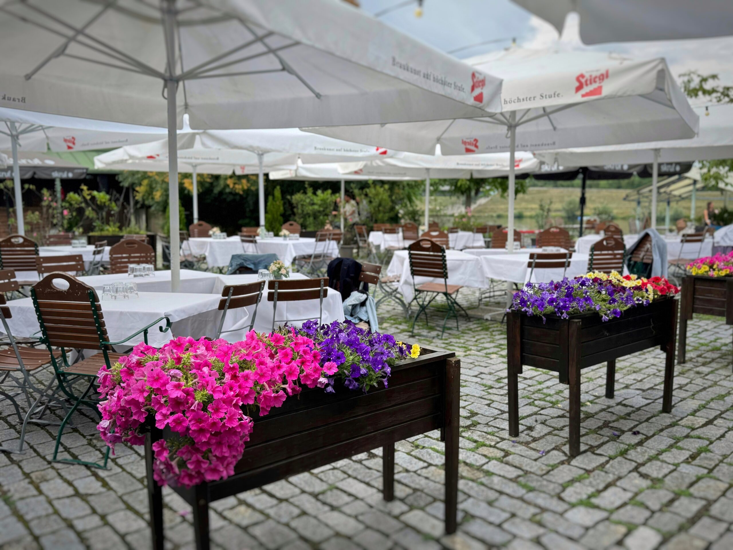 Sollte das Wetter einmal nicht ganz mitspielen, stehen im Außenbereich Gastgartenschirme sowie überdachte Bereiche bei den Sitzstiegen zur Verfügung.